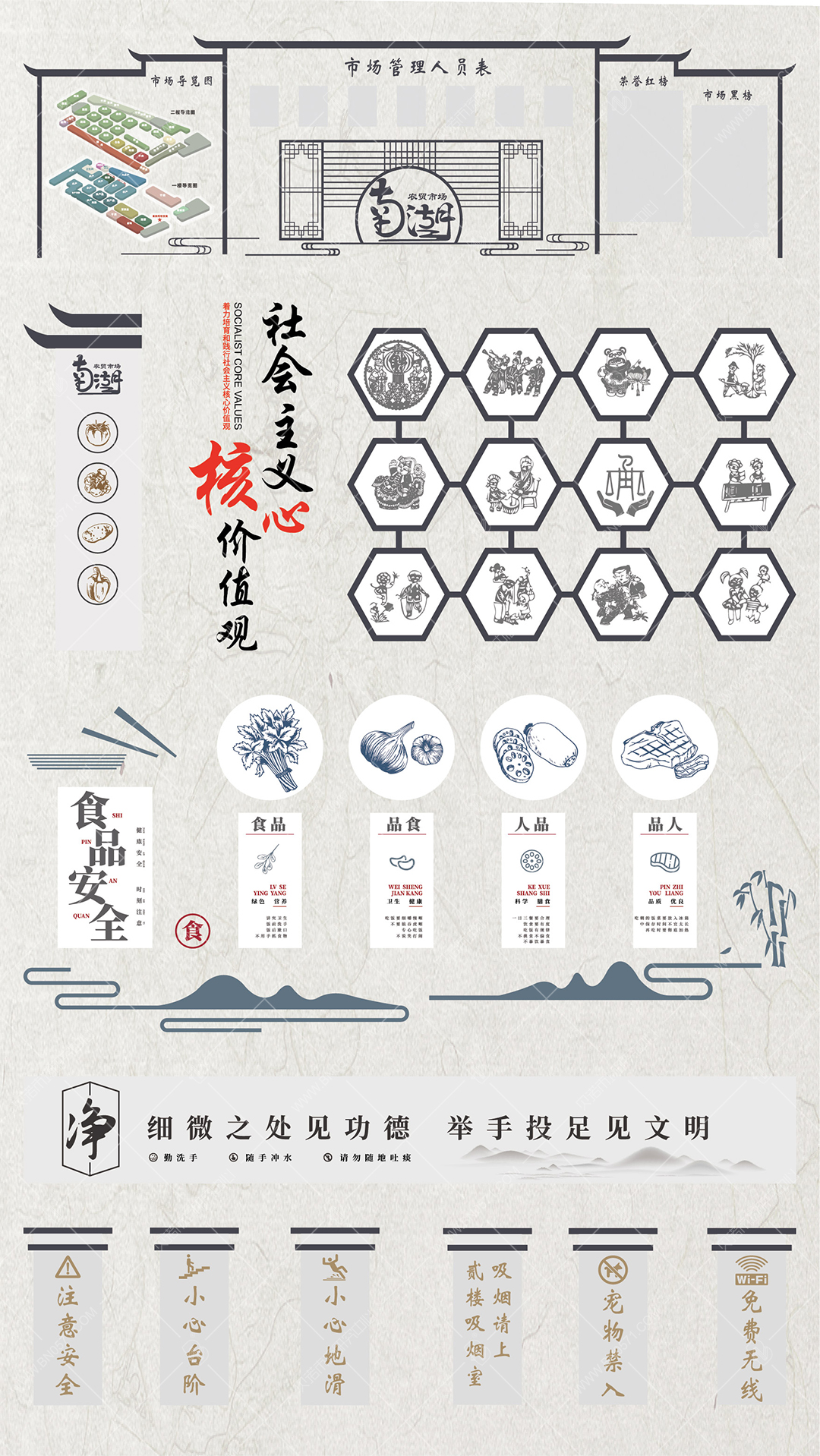 ·农贸市场设计中增添文化墙、软装氛围设计等等,同时增设扶梯、食品安全检测室,加码市场硬实力。